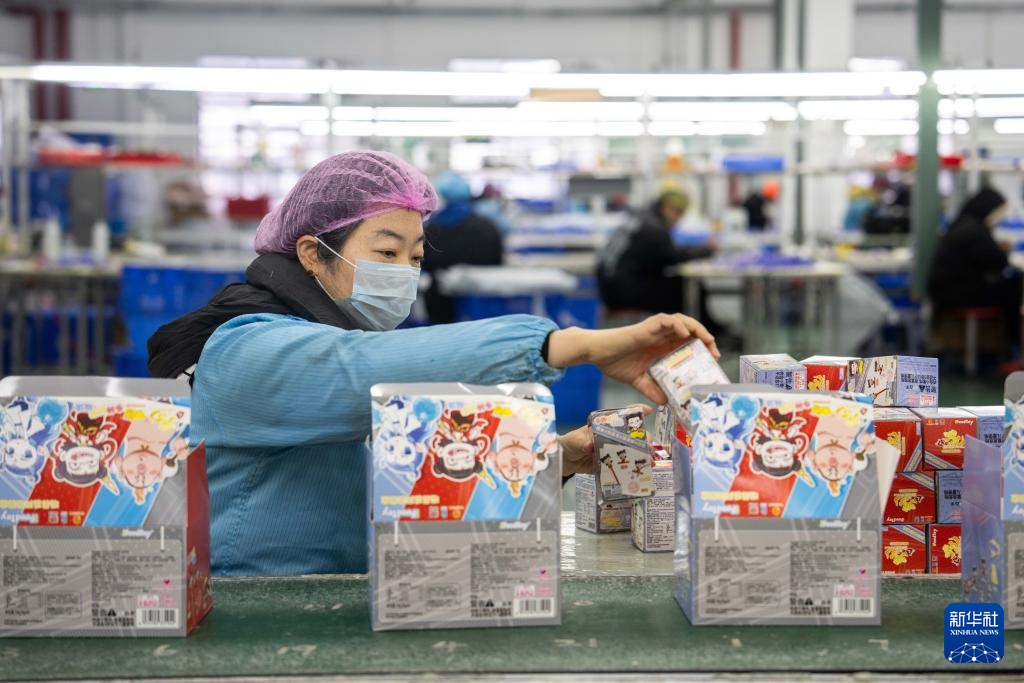 2月8日,在坐落湘潭归纳保税区的湖南桑尼森迪玩具制作有限公司,工人在包装“哪吒”系列周边玩具。
