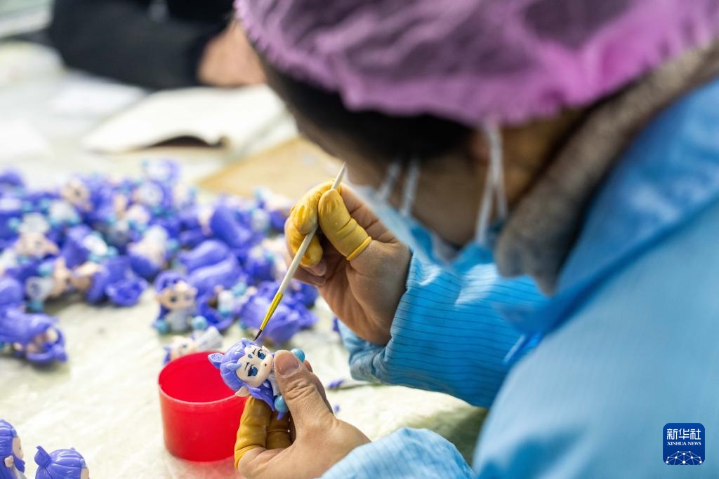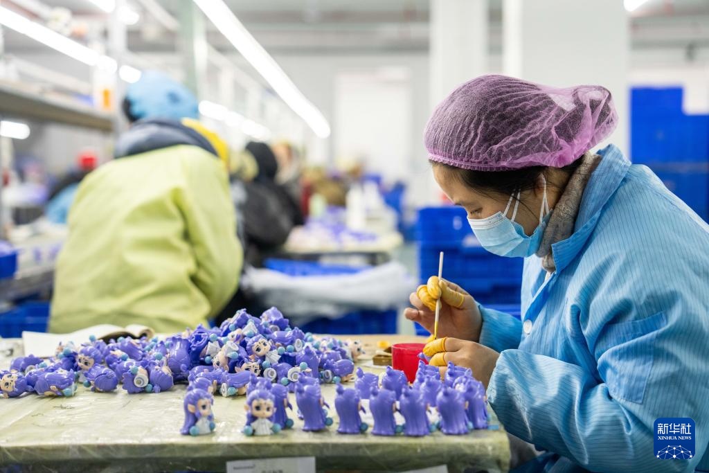 2月8日,在坐落湘潭归纳保税区的湖南桑尼森迪玩具制作有限公司,工人在制作“敖丙”手办。